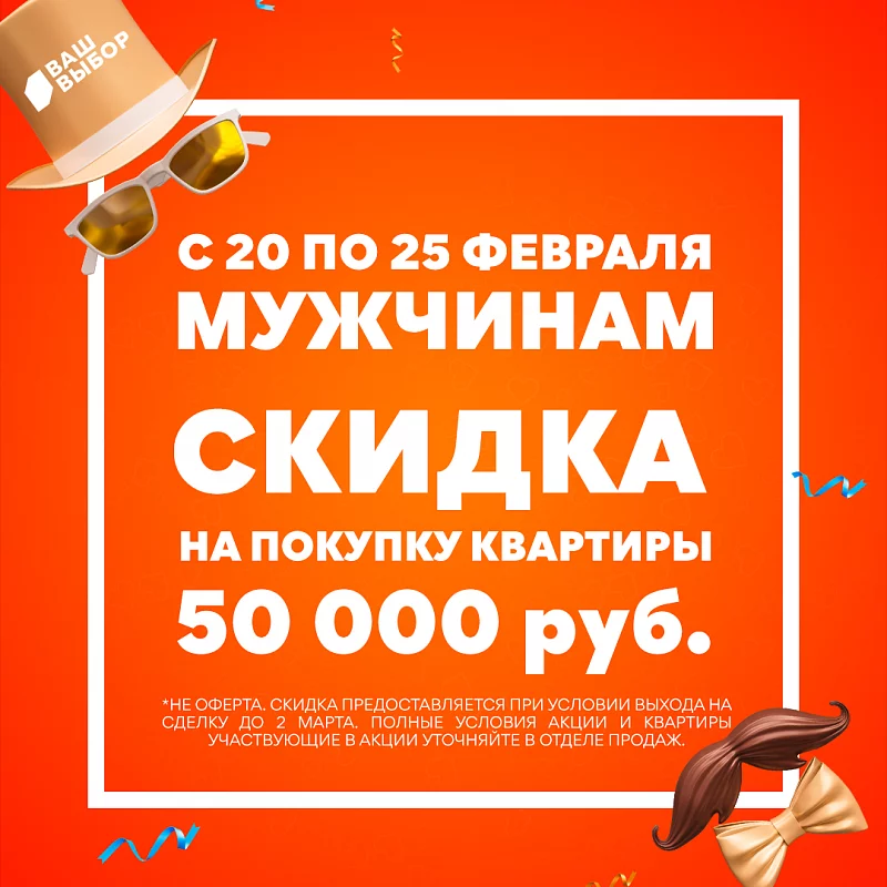 С 20 по 25 февраля 2024г, всем мужчинам, дарим скидку в 50 000 рублей на покупку квартиры.