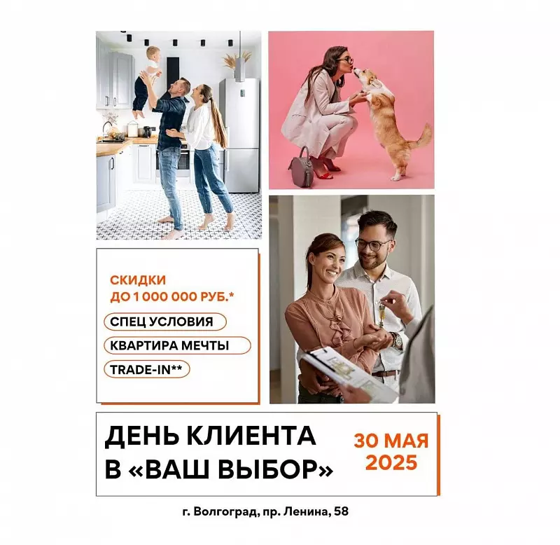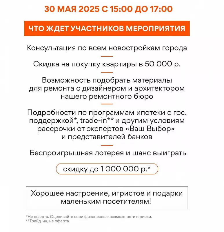 30 мая с 15:00 до 17:00 приглашаем на День Клиента в «Ваш Выбор». Разыгрываем до 1 000 000 ₽* на покупку квартиры мечты 🗝