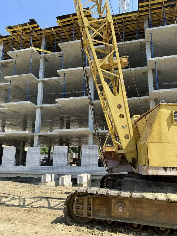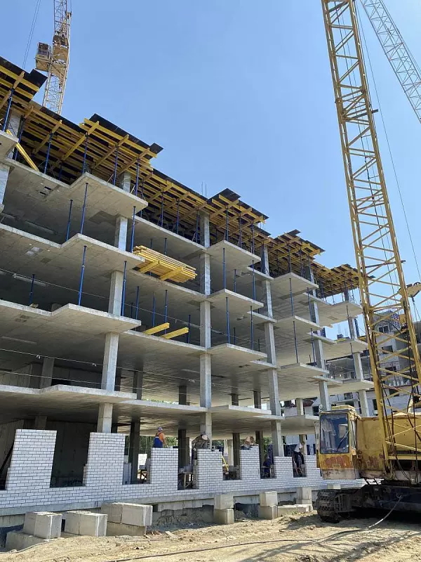 Строительные работы идут полным ходом ( начало июля), возводится 5 этаж жилого дома, а с торца здания уже приступили к кирпичной кладке. Смотрите наш фотоотчет со стройки на нашем сайте.