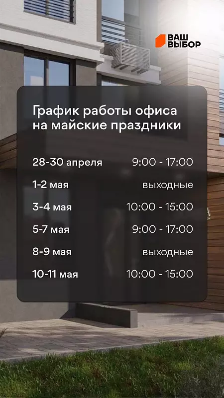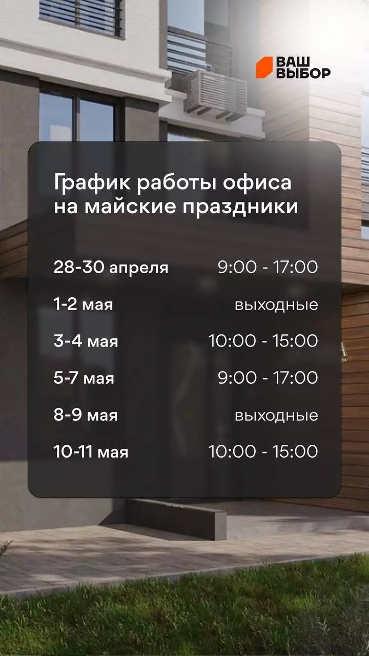 А вот со следующей недели мы работаем по праздничному графику. Обратите внимание, если планировали визит в офис «Ваш Выбор» в начале мая ☺️