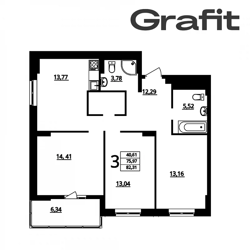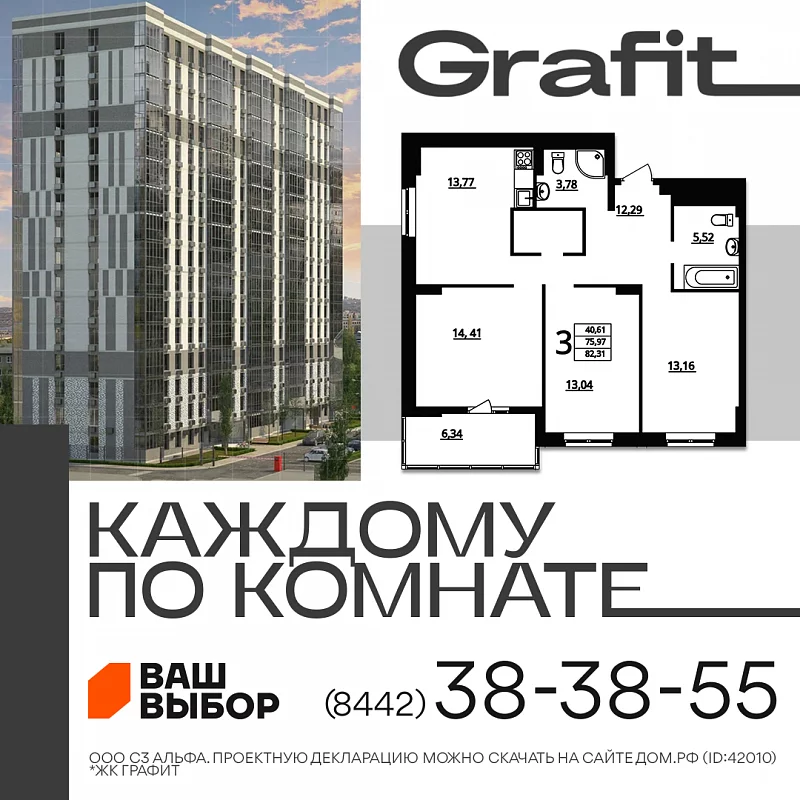 Сегодня, хотим познакомить Вас с шикарной, на наш взгляд, планировкой в жилом комплексе Графит - 3х комн. квартира 82 м2: