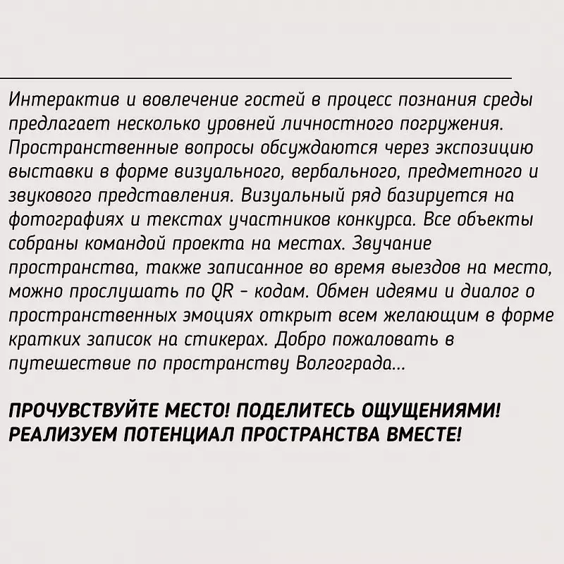 Интерактив и вовлечение гостей в процесс познания среды предлагает несколько уровней личностного погружения. Пространственные вопросы обсуждаются через экспозицию выставки в форме визуального, вербального, предметного и звукового представления. Визуальный ряд базируется на фотографиях и текстах участников конкурса. Все объекты собраны командой проекта на местах. Звучание пространства, также записанное во время выездов на место, можно прослушать по QR - кодам. Обмен идеями и диалог о пространственных эмоциях открыт всем желающим в форме кратких записок на стикерах. Добро пожаловать в путешествие по пространству Волгограда...