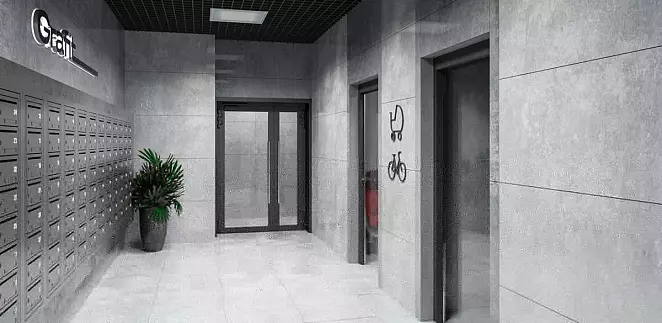 Отделка холлов будет выполнена в лаконичном стиле, дизайнерское оформление включает применением качественного керамогранита и элементы декора стен. В каждой секции имеются два бесшумных высокоскоростных лифта – пассажирский и грузопассажирский.