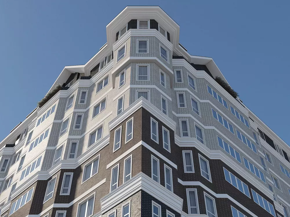 Натуральный клинкерный кирпич цвета коричневая ночь на первых этажах и лаконичные оттенки серого в отделке фасадов, большие окна, выразительные эркеры, видовые террасы на верхних этажах, кровля из натуральной черепицы, обрамление фасада молдингами — пожалуй, именно таким должен быть современный дом премиум-класса в топовой локации — строгим и притягательным, респектабельным и вдохновляющим, гармоничным и многогранным.