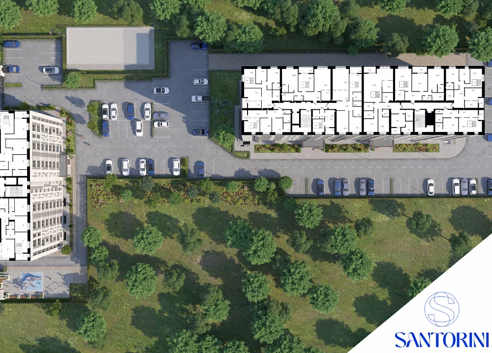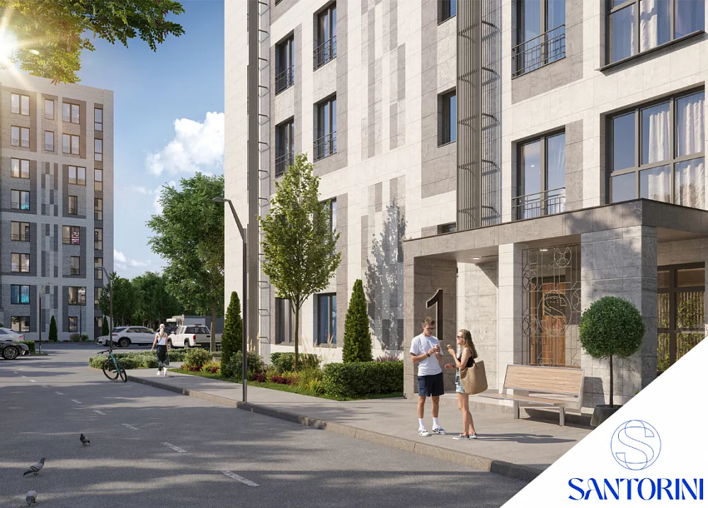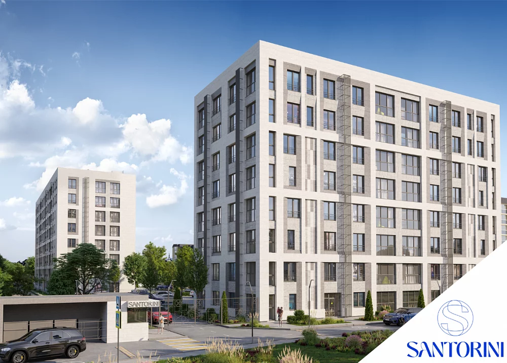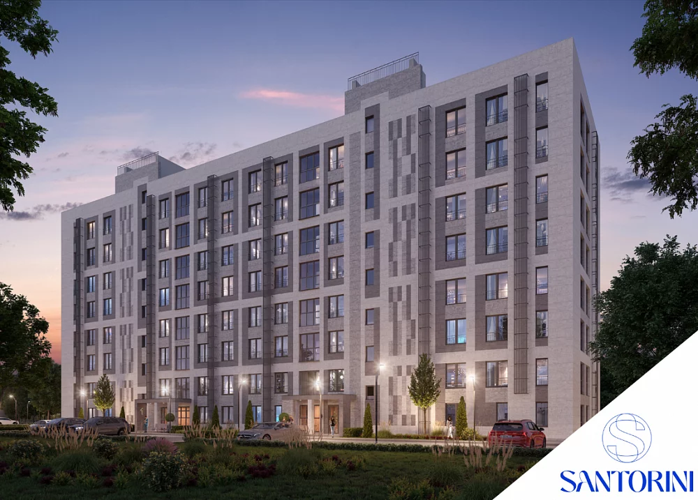 Санторини. Эксклюзивный проект разработан ведущим архитектурным бюро, и возводится по новейшим европейским стандартам жилищного строительства. Комплекс состоит из двух домов, выполнен в сдержанном стиле, с четкими линиями в рисунке фасада. Вместе здания формируют особенный ансамбль, прекрасно вписывающийся в урбанистическую концепцию сформированного района.