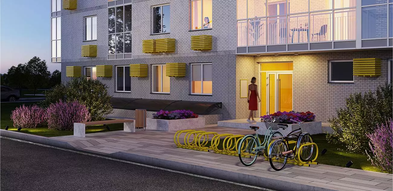 У входа в подъезд есть парковочные места для велосипедов, а для молодых семей с детьми на первом этаже холла запроектирована колясочная, в которой можно оставить на хранение любой детский транспорт.