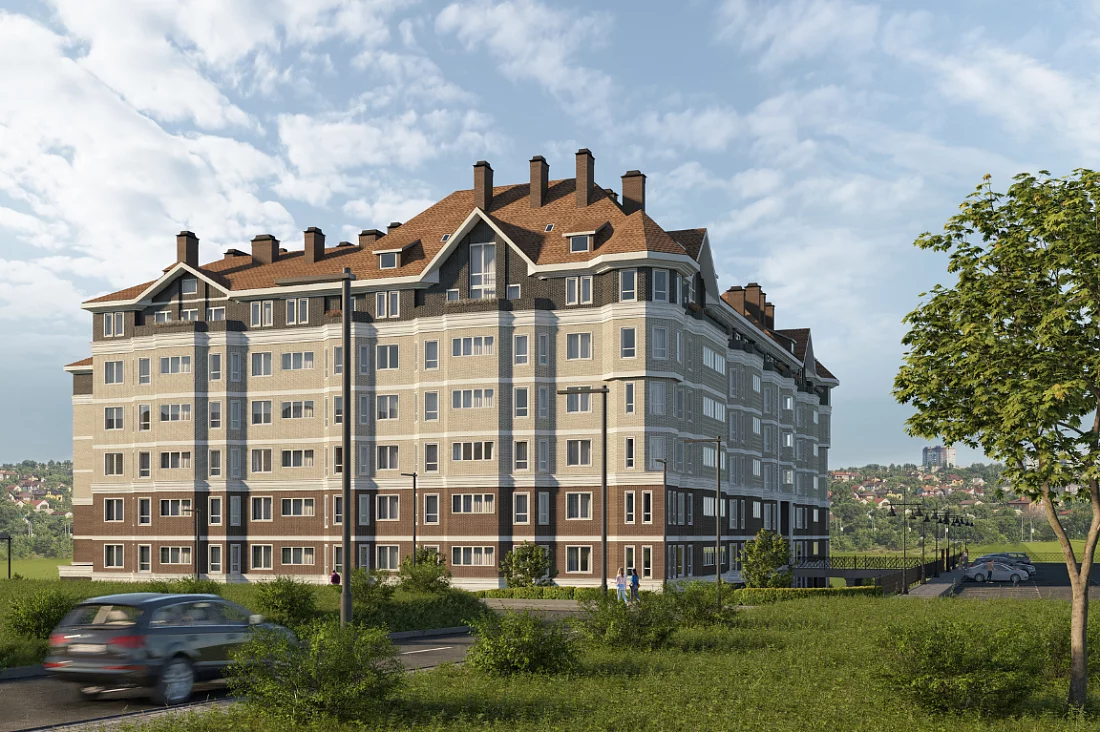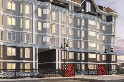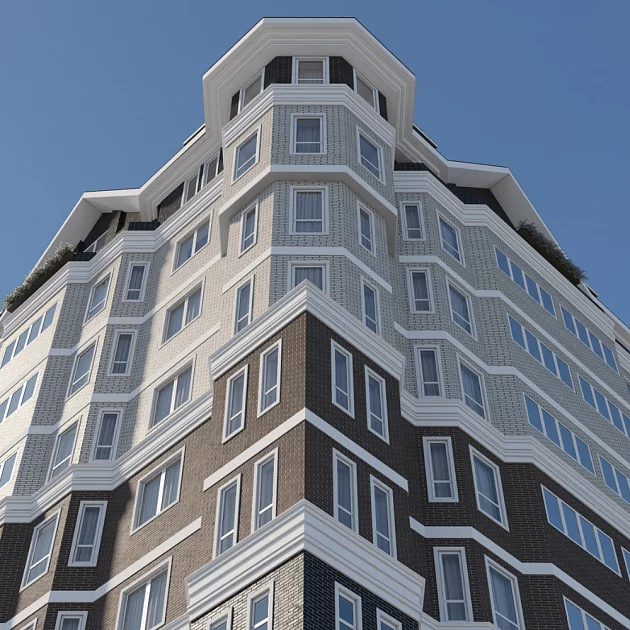 Натуральный клинкерный кирпич цвета коричневая ночь на первых этажах и лаконичные оттенки серого в отделке фасадов, большие окна, выразительные эркеры, видовые террасы на верхних этажах, кровля из натуральной черепицы, обрамление фасада молдингами — пожалуй, именно таким должен быть современный дом премиум-класса в топовой локации — строгим и притягательным, респектабельным и вдохновляющим, гармоничным и многогранным.