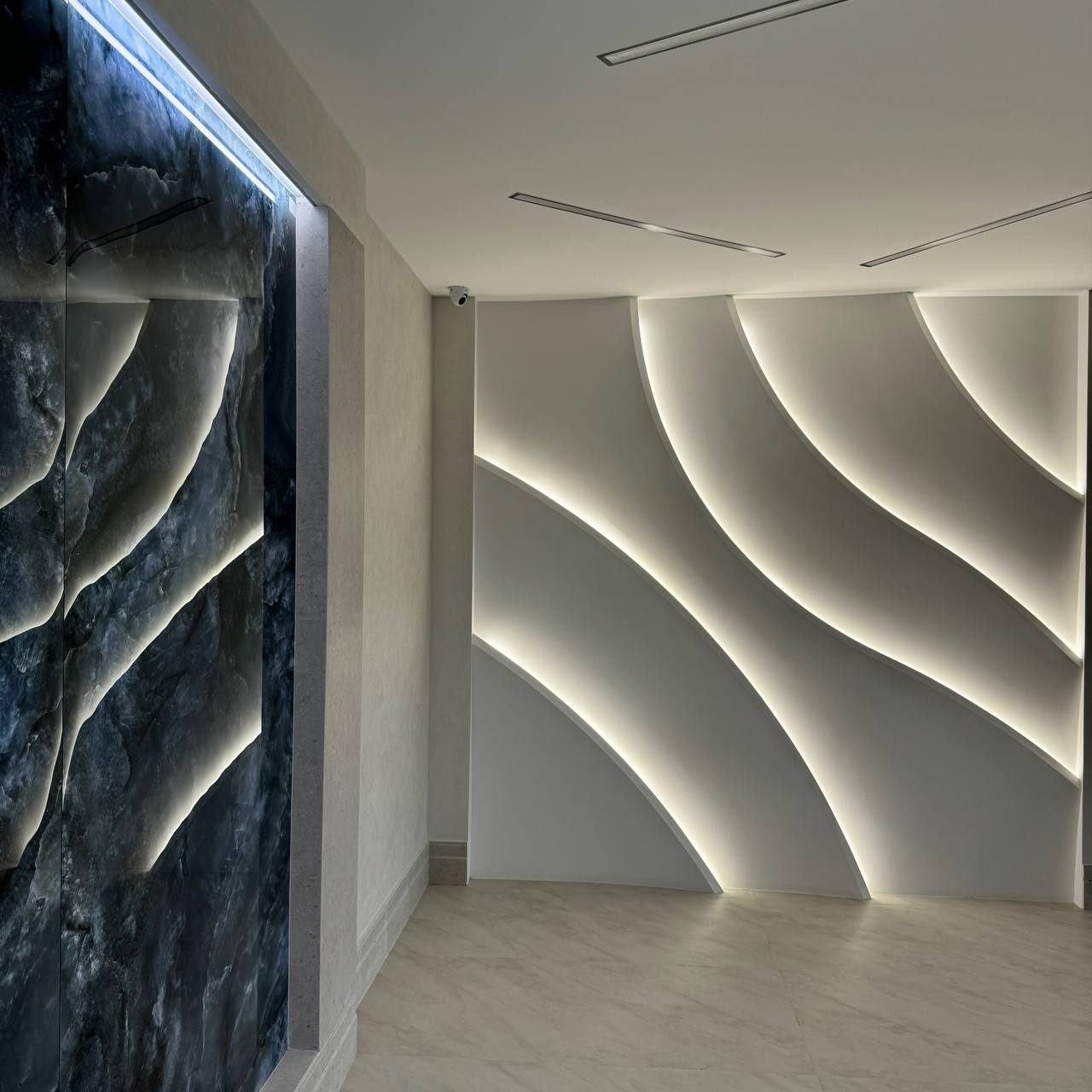Керамогранит люксового качества выполнен в трех цветовых решениях, где гармонично сочетаются темные и светлые оттенки мраморного узора. Все это создает строгую геометрию простых форм. И придает комплексу по-настоящему запоминающийся вид на долгие годы.